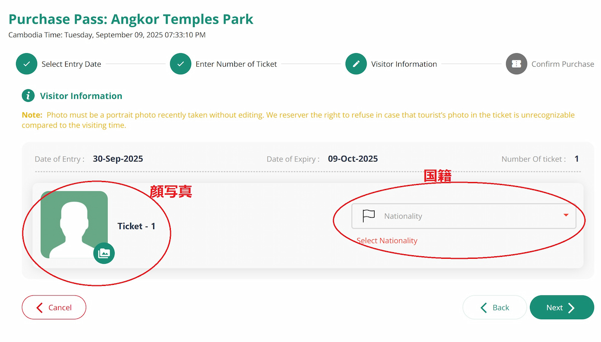 顔写真も必要です。あとは国籍や名前など必要な情報を入力して支払いを済ませます。メールでチケットが届くので印刷もしくはスマホに保存して完了です。