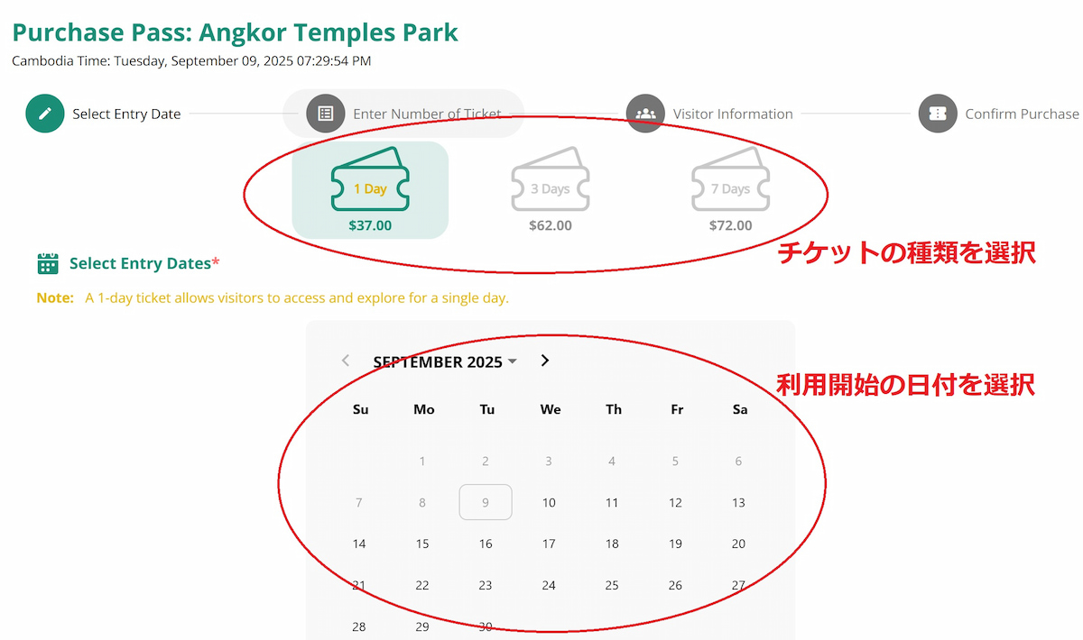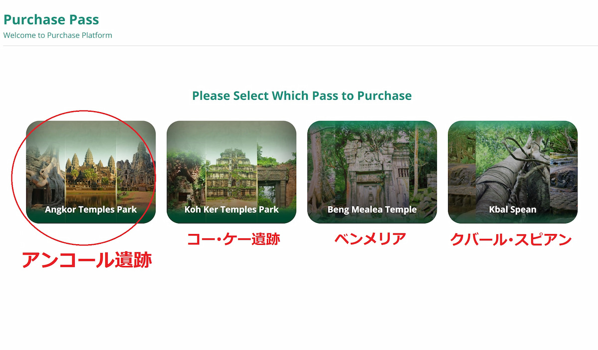 アカウント作成したら(Googleアカウントでもログイン可能)、一番左のアンコールパスのAngkor Temples Parkを選択します。ちなみに他の遺跡の単独入場チケットもオンラインで購入できます。