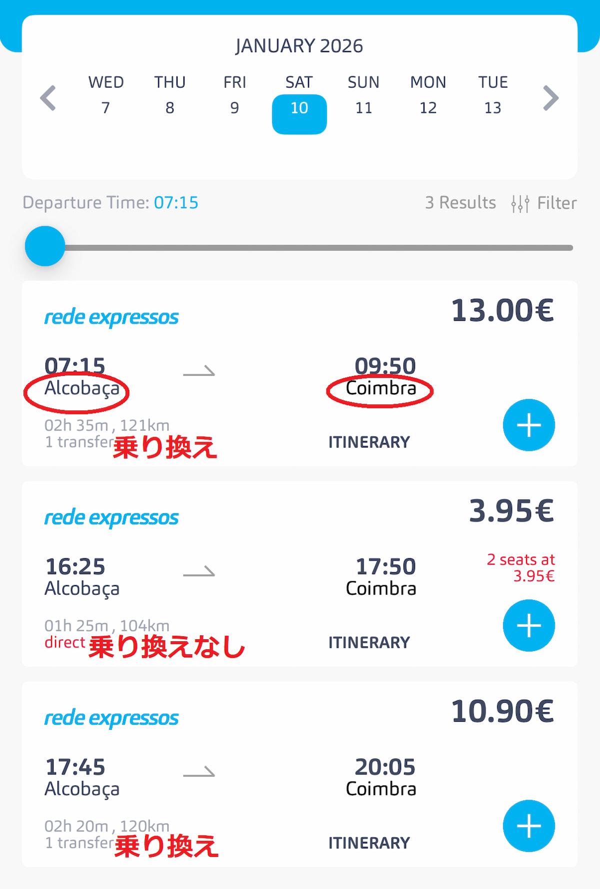 アルコバッサからコインブラへはバスのみで行くこともできます。調べた所、Rede Expressosで行くことができます。以下がスケジュールと料金です。直通が1本、あとの2本は乗り換えです。乗り換え地点はNazareになります。詳細はRede Expressosの公式サイトかアプリにて。