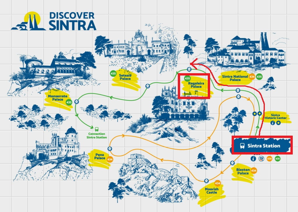 レガレイラ宮殿への行き方ですが、シントラ駅前からScotturb社の巡回バス435番で行くことができます。始発は9:00で、10分置きに出ています。自分はムーアの城跡から移動したので、一旦434番バスでシントラ宮殿まで行き、その後レガレイラ宮殿までは歩いていきました。