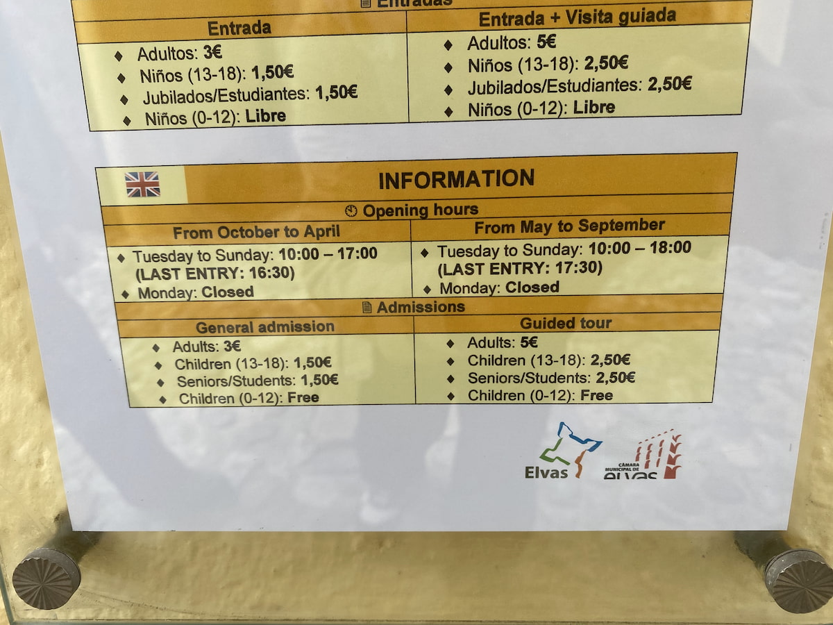 2024年4月時点と変わらないですね。エルヴァスの観光施設は軒並み月曜休みのようなので、訪問する際は注意が必要です。