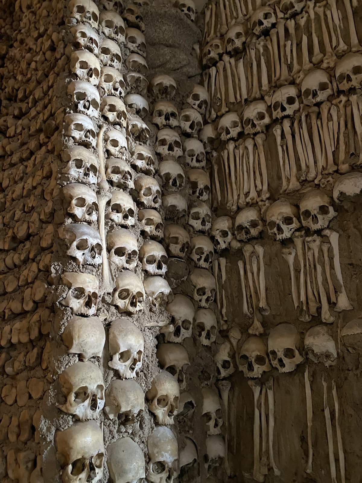 中に足を踏み入れると言葉を失いました…。推定5000体の人骨が礼拝堂一面に敷き詰められています。納骨堂はフランシスコ会により建てられましたが、墓地に埋葬されていた大量の人骨を掘り起こして利用したとのことです。