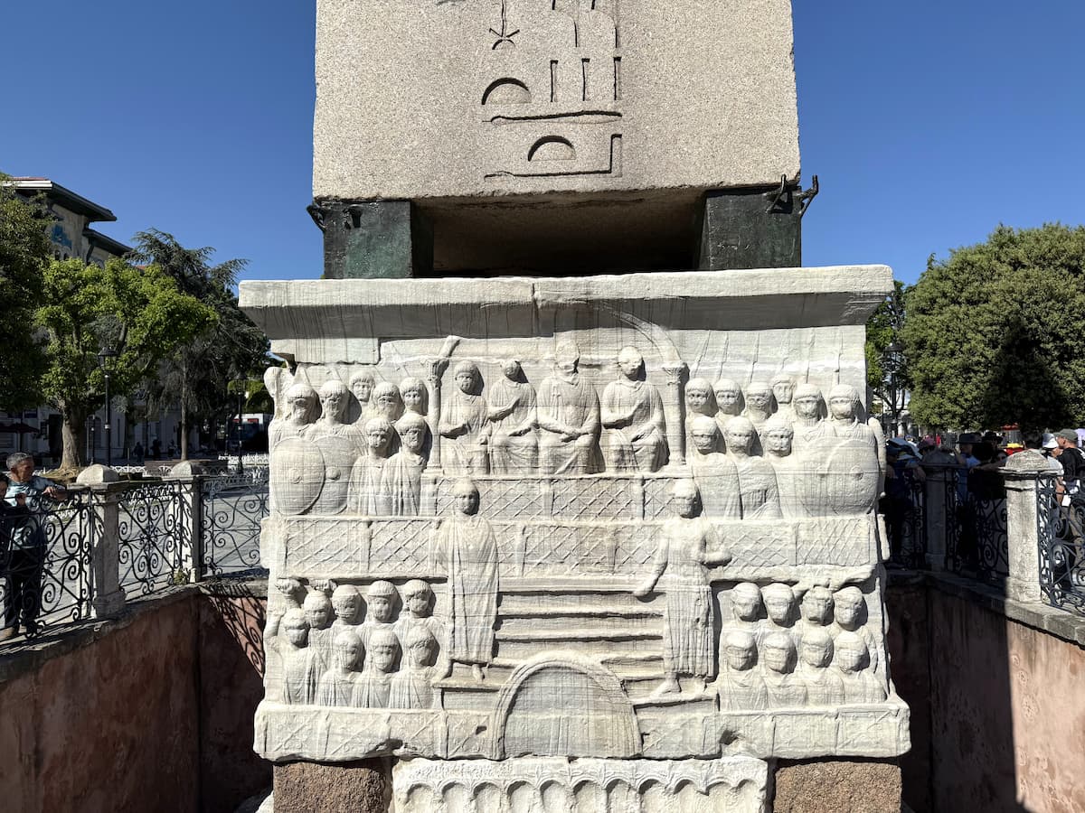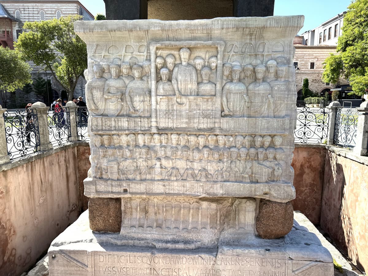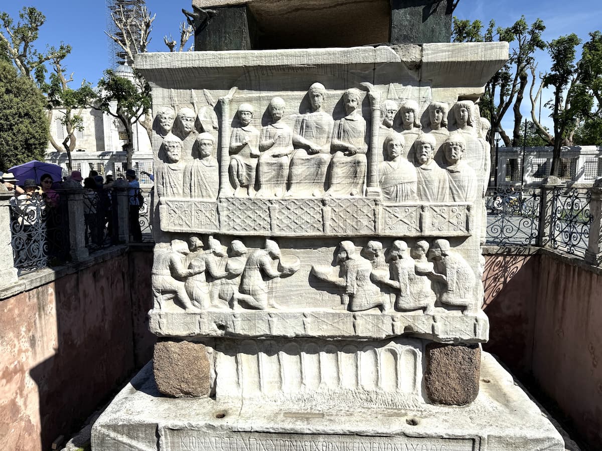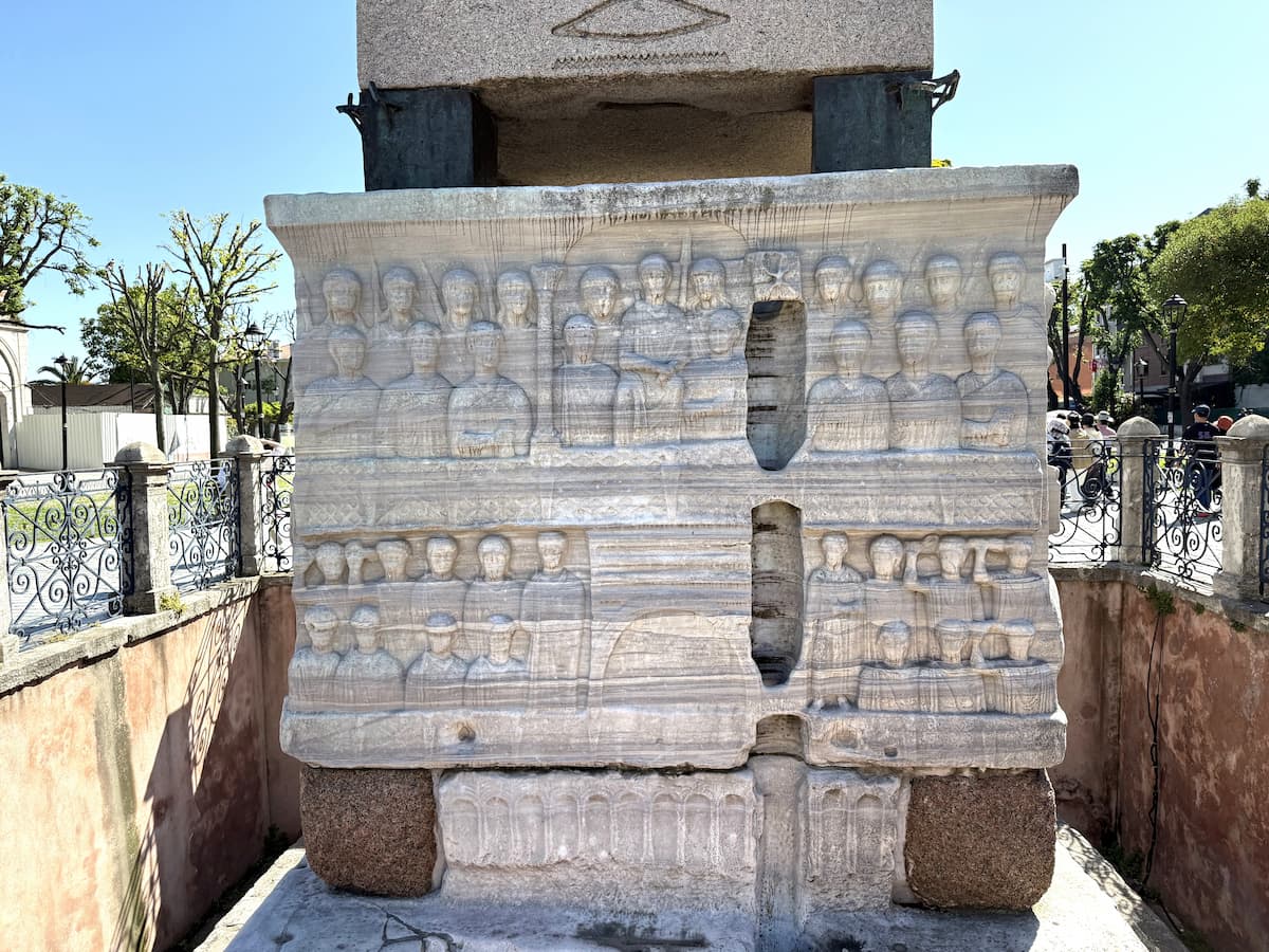 オベリスクの台座は大理石で、これはテオドシウス1世により設置されました。テオドシウス1世が競馬レースの勝者に月桂冠を授ける内容のレリーフが描かれています(手に月桂冠を持ってる)。1番下にはラテン語の碑文もあります。
