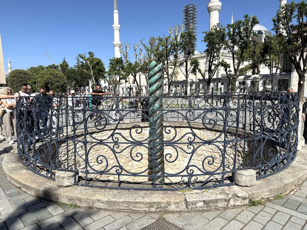 「蛇の柱」は、ローマ皇帝コンスタンティヌス1世が、4世紀後半にギリシャのデルフォイのアポロン神殿からコンスタンティノープルまで運んできたものです。蛇の柱もかなり歴史は古く、プラタイアの戦い(紀元前479年)でギリシア連合軍がアケメネス朝ペルシアに勝利したことを記念に造られました。トトメス3世のオベリスクといい、何でも運んできますね(笑)。それだけ当時のローマ帝国の支配力が圧倒的だったんでしょうね。