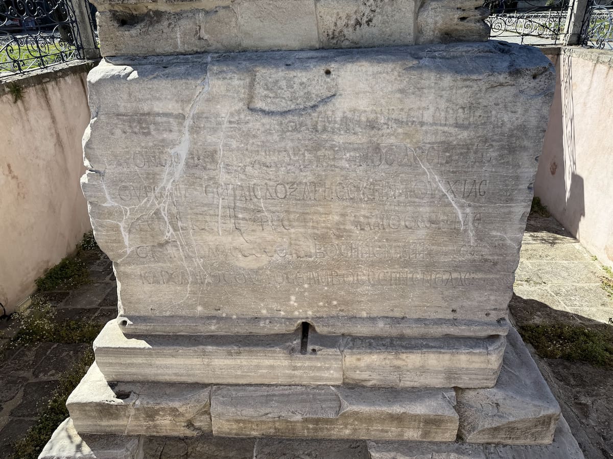 大理石の土台にはうっすら文字が書かれています。説明によればギリシャ文字の碑文とのことです。