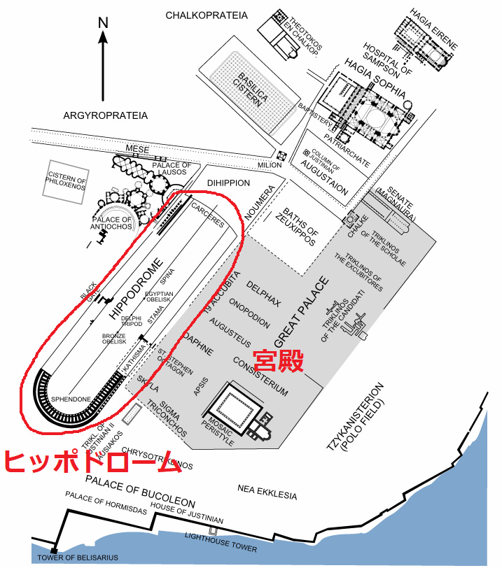 現在の地図でヒッポドロームの主な見どころに番号を付けました。