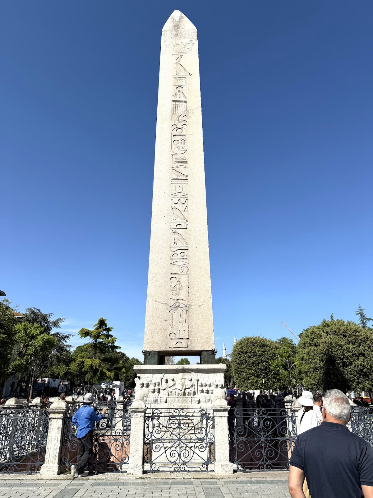 花崗岩でできており、かなり状態が良いです。紀元前1490年のものと考えると信じられないくらい綺麗です。オベリスクにはトトメス3世を讃えるヒエログリフ(神聖文字)が書かれています。コンスタンティノープルまでの運搬中に損傷したため、元々30mあったものが20m弱になってしまったとか…。そんなこともあり残念ながらヒエログリフは途中で切れちゃってます(泣)。台座まで含めると26mほどあります。