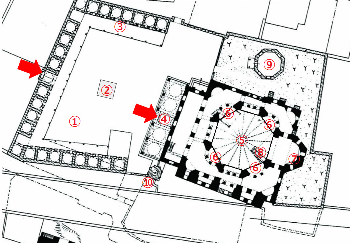 中庭を出ると目の前には、キュチュク・アヤソフィア(リトル・ハギア・ソフィア)の入口と柱廊(④)があります。柱廊は小ドーム5つで構成されています。