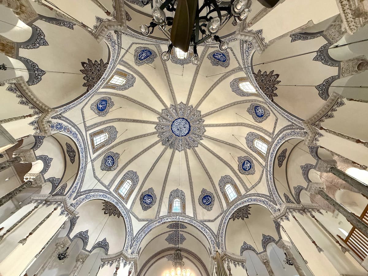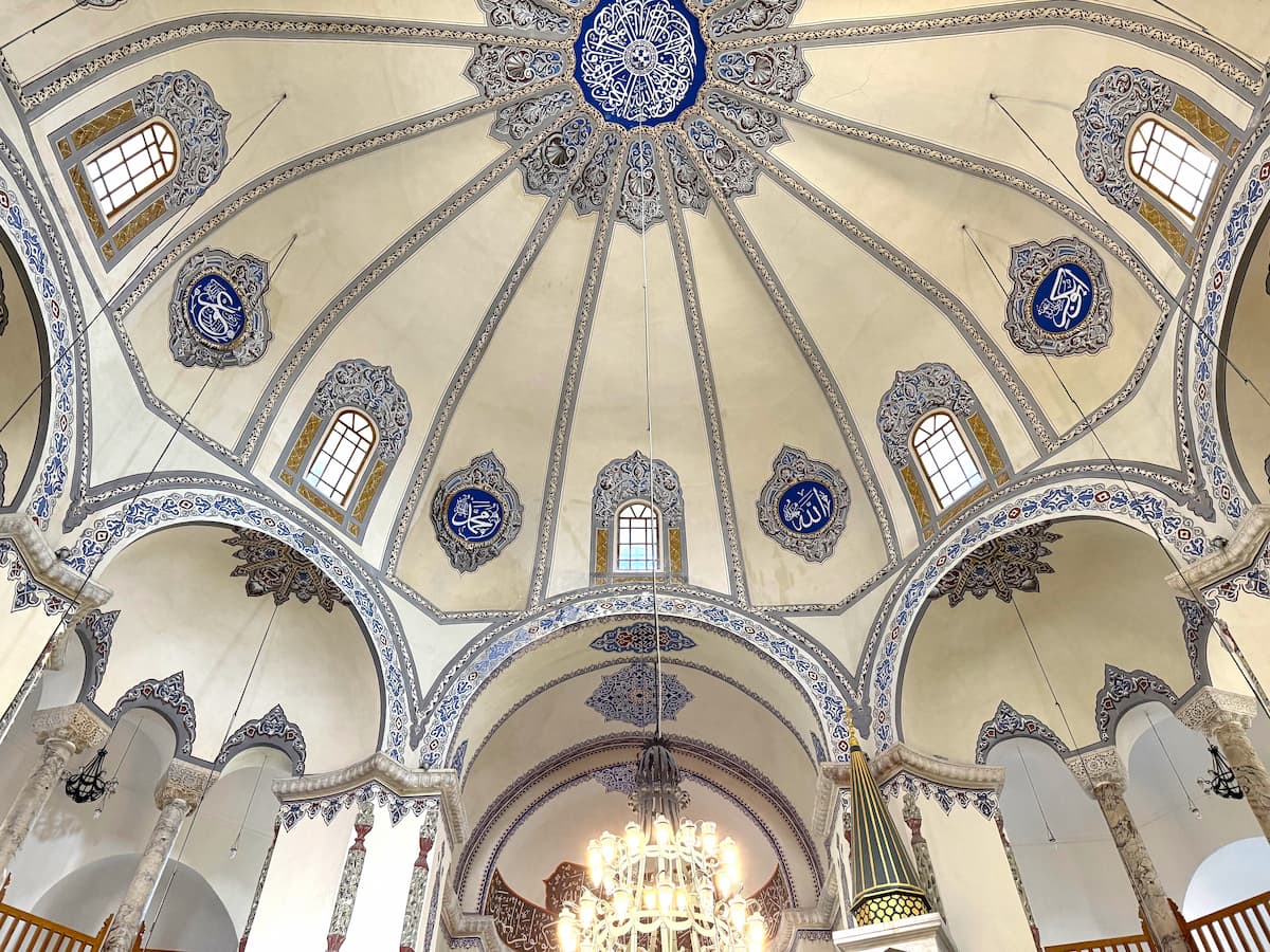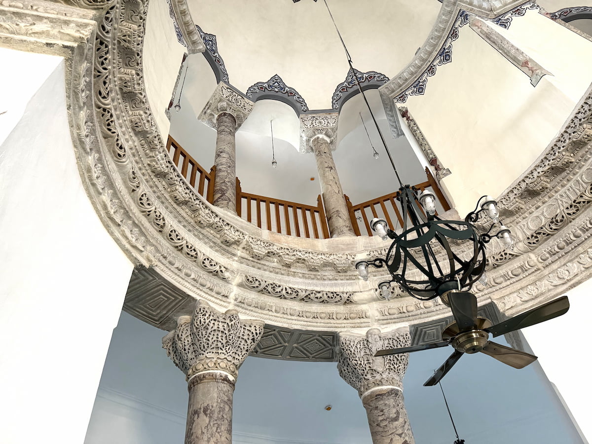 全体的に漆喰で覆われており、その上に幾何学模様などの絵が描かれています。元々教会なのでモザイク画などの聖像画があったと思うんですが、モスクに改装される時に漆喰で隠されてしまったようです。剥がしたら出てくるのでしょうか。