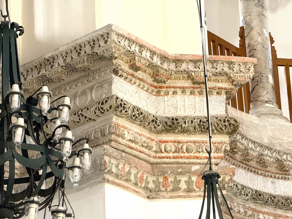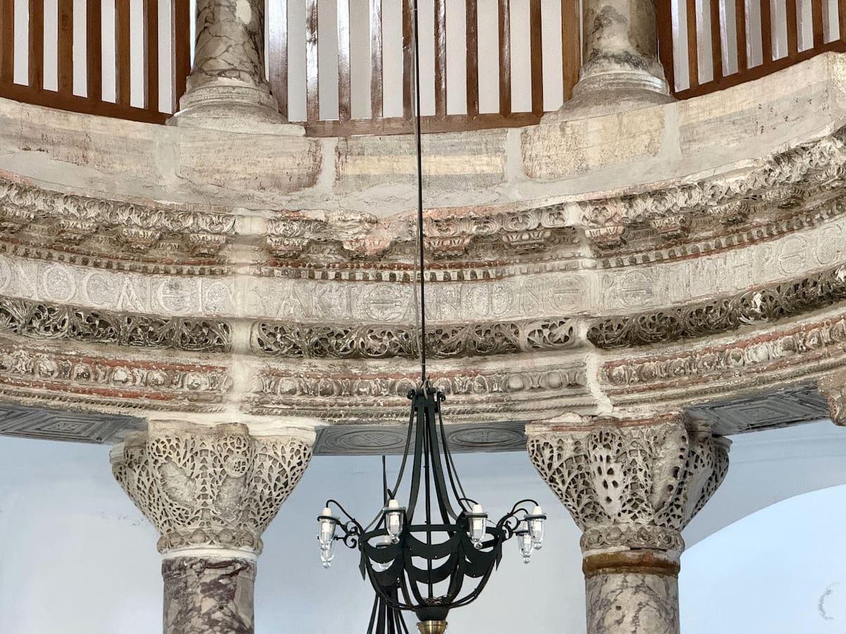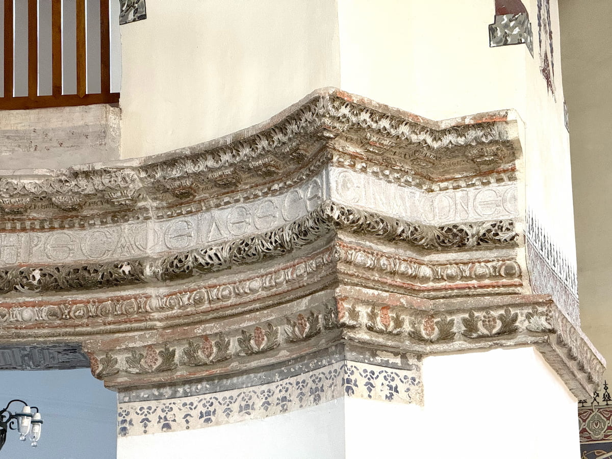 柱頭の上の水平部分(エンタブラチュアと呼ばれる)にも透かし彫りなどレリーフがありお見事です。皇帝ユスティニアヌス1世、妻テオドラ、聖ゼルギウスに捧げられたギリシャ語の碑文が彫られています。
